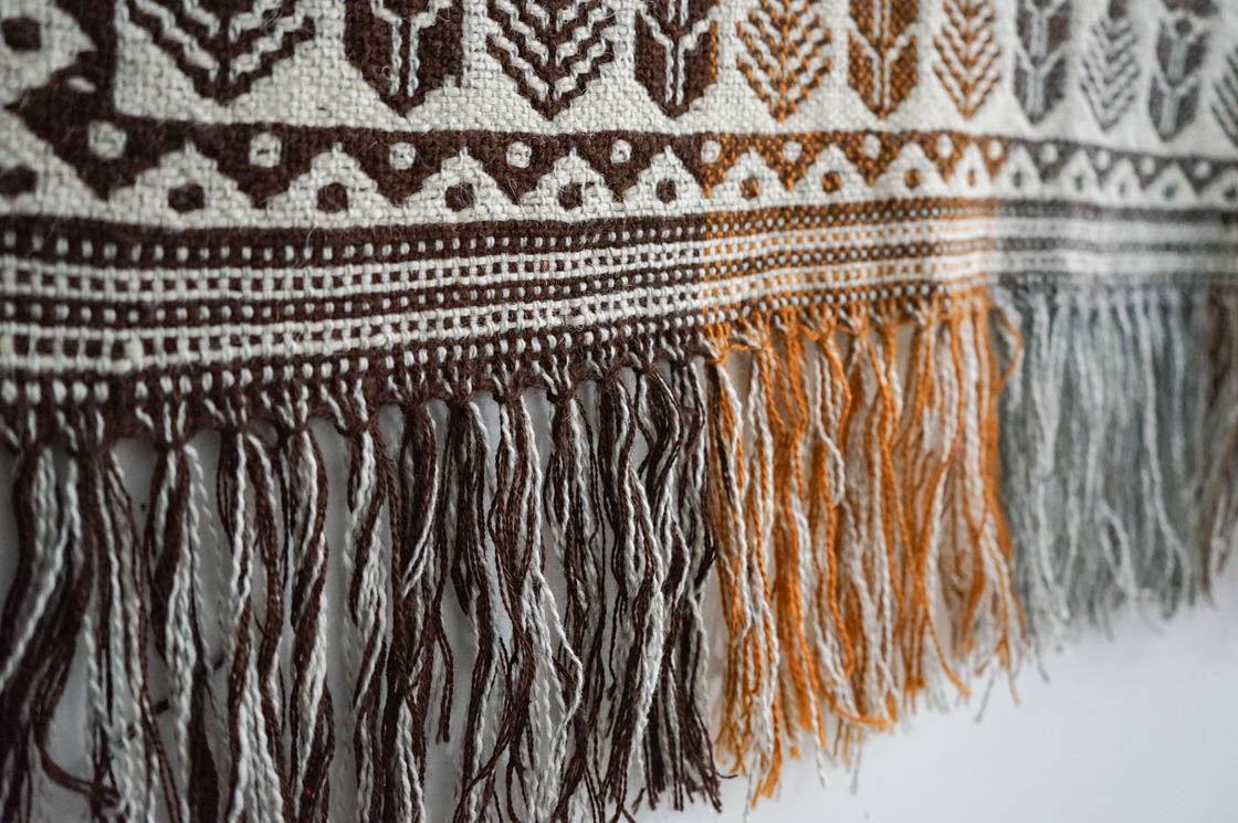 昔ながらの木製の織り機を使い、羊の毛糸を時間をかけて織りあげる、
