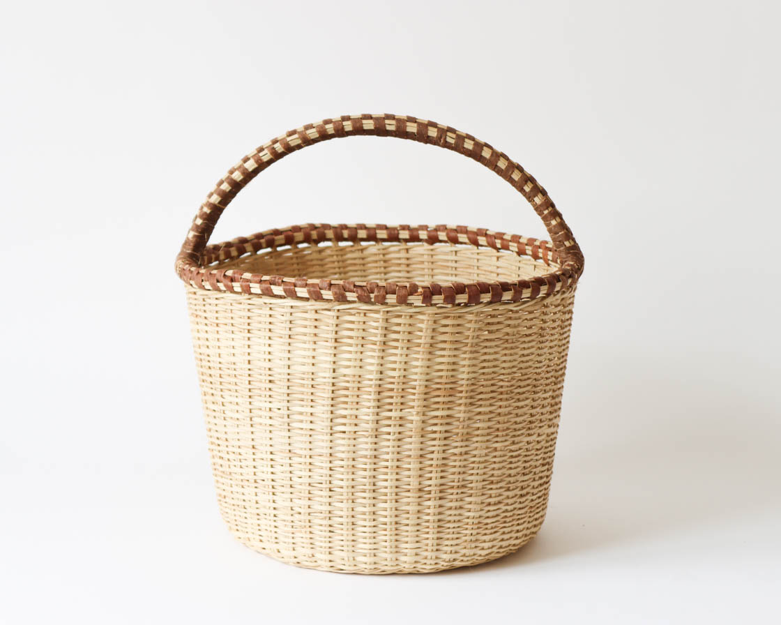 縁巻きと持ち手には、濃色の樹皮を巻きつけています。強度を高めると同時に、くっきりとした濃淡がアクセントに。この地域独特のかごです。