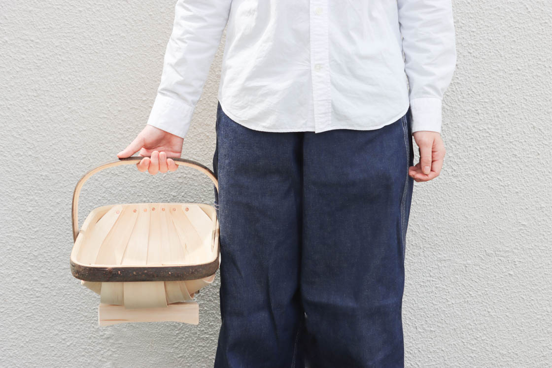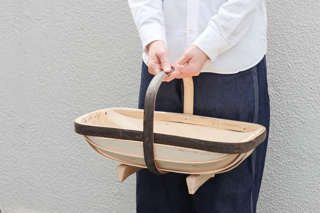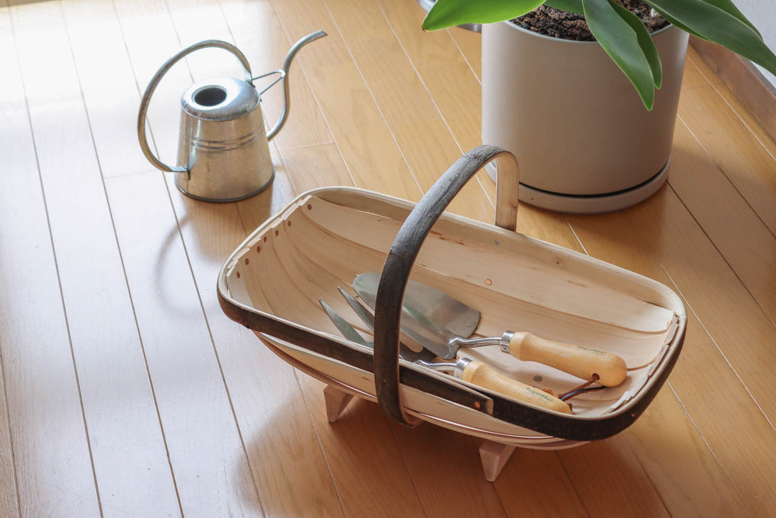 イギリスでは、ガーデニング用のかごといえば王室御用達のこの形。フレームには硬い栗、底板にはしなやかなヤナギの木をつかった、船のようなシルエットが印象的です。