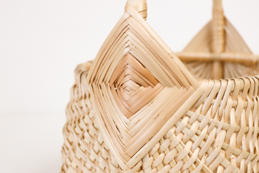 持ち手の付け根にほどこされたひし形の飾り編み。この地域のかごの古典的なデザインの一つで、補強も兼ねています。