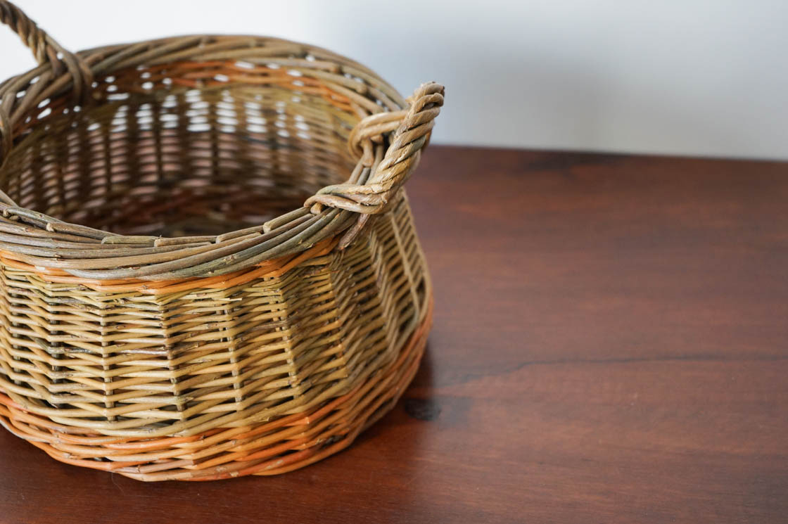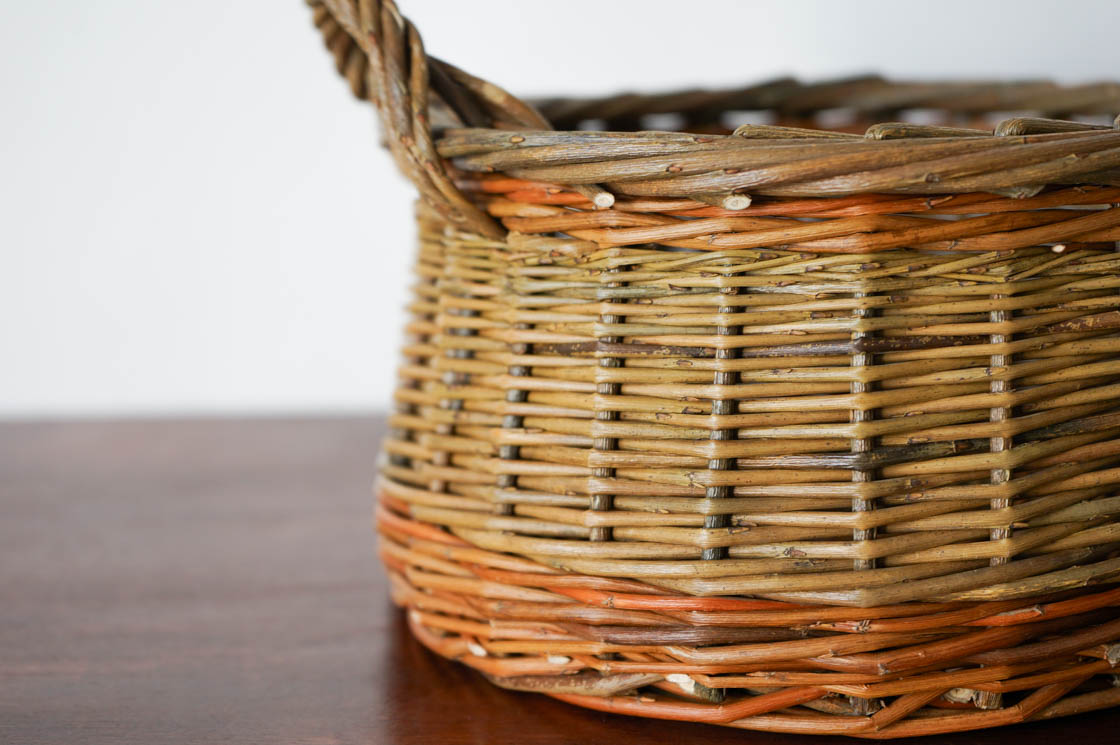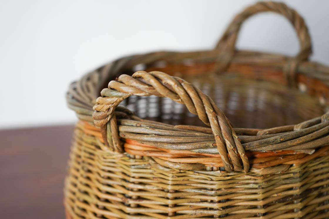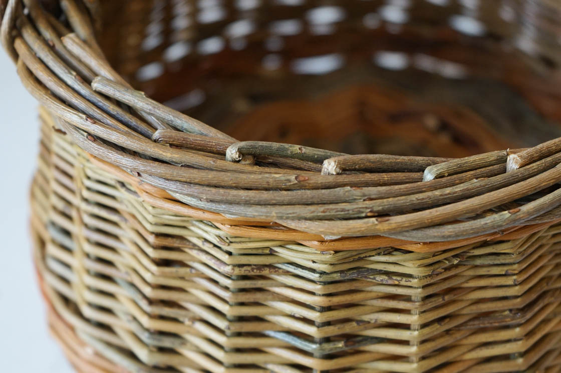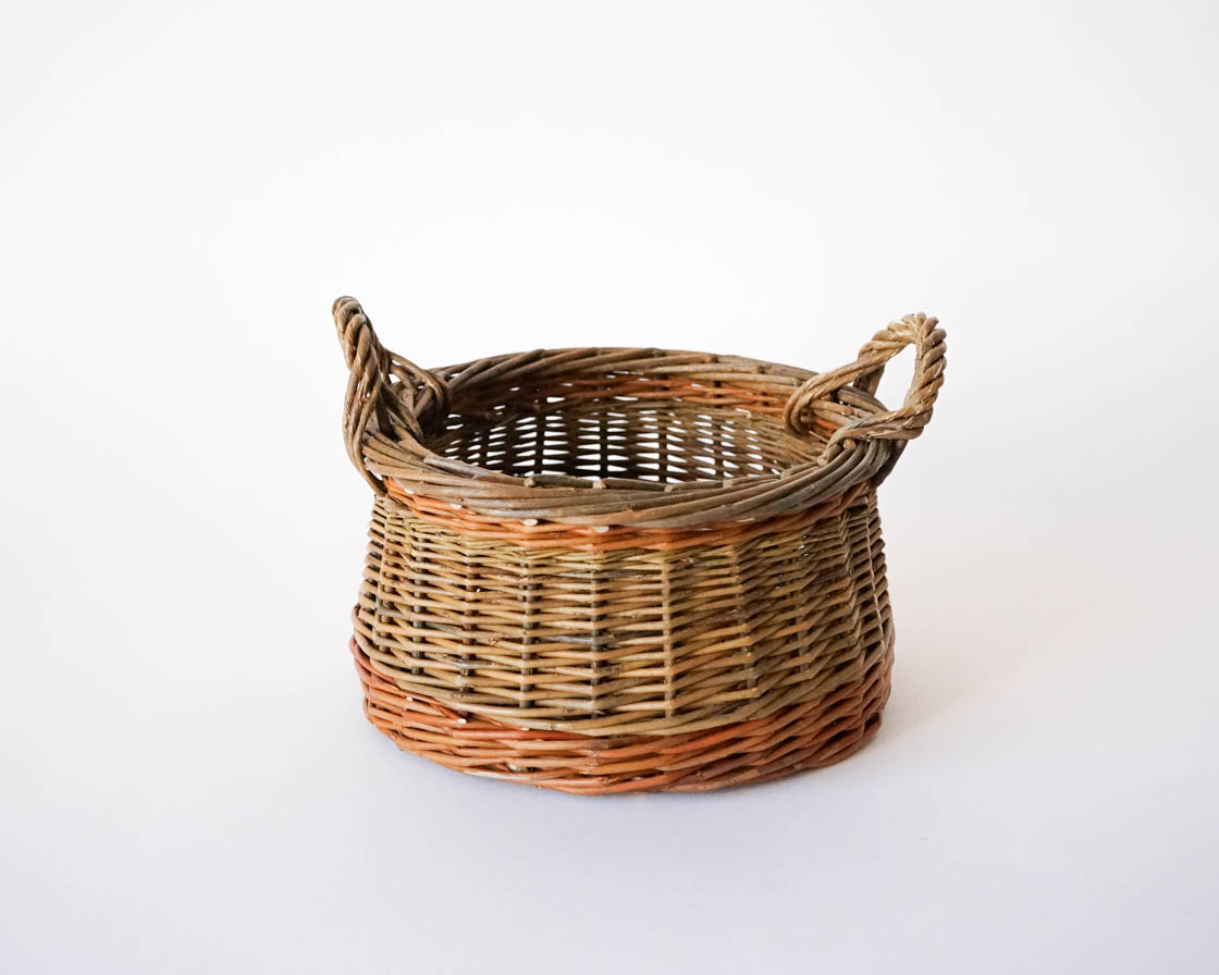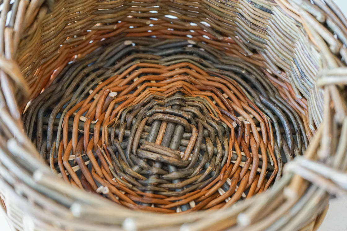 クルミかご という名の付いた、直径20センチほどの小さな手付きのかご。ヤナギの枝を編んだものです。