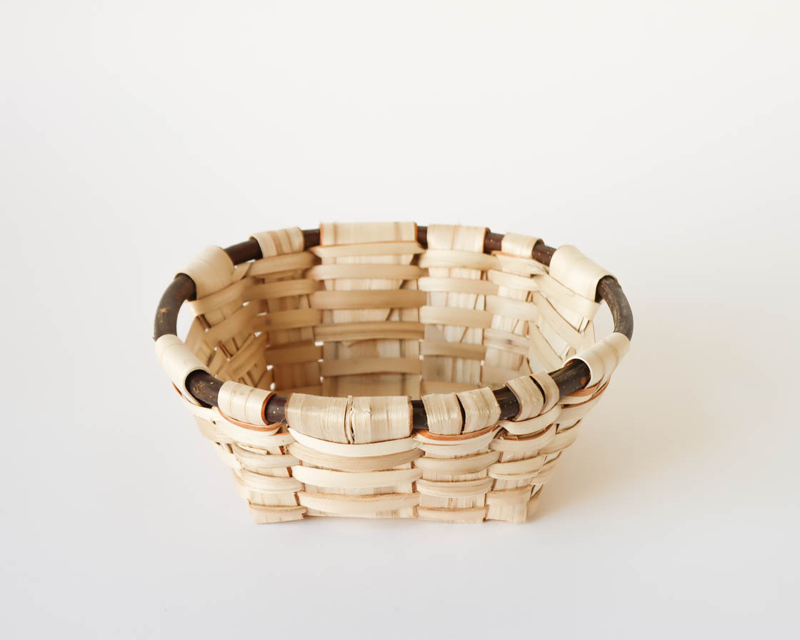 うすく削った「へぎ材」を編んだ、丈夫で軽いかご。明るい木肌と、茶色い枝のコントラストが特徴です。