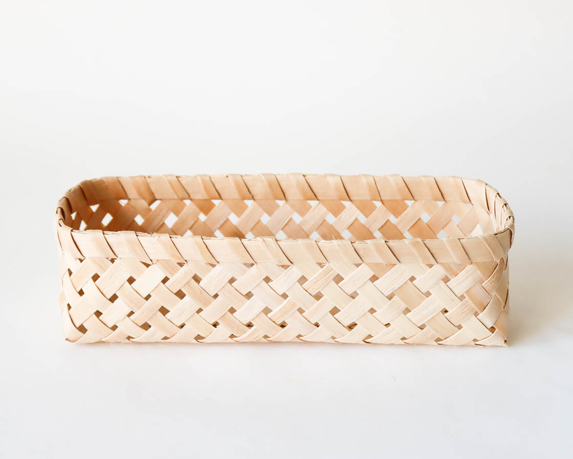 長方形のトレイは、カトラリーや、小さな器などの収納に使いやすいサイズ。材料をぎりぎりまで薄く削りあげた、ごく軽く、繊細な仕上がりです。