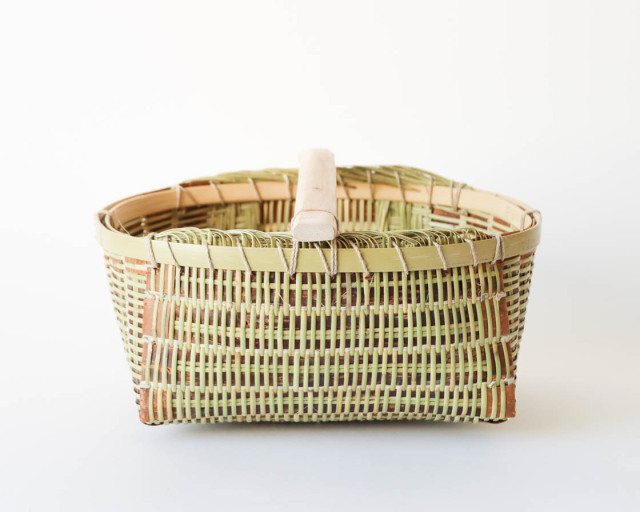 篠竹・山桜・藤・真竹など、さまざまな植物を組み合わせた手の込んだ作り。強さと実用性のために考えだされた巧妙な構造から、このかごだけが持つ美しさがにじみ出ています。