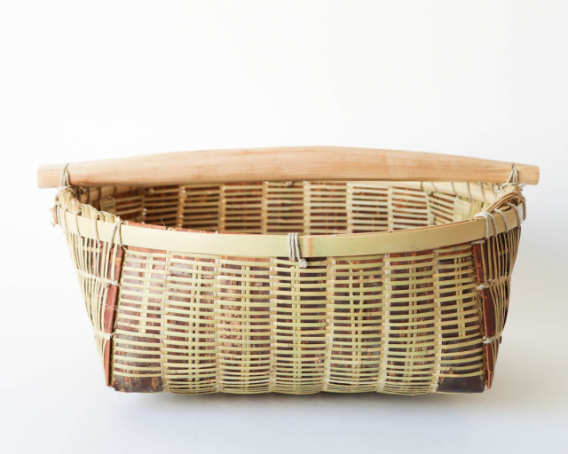 篠竹・山桜・藤・真竹など、さまざまな植物を組み合わせた手の込んだ作り。強さと実用性のために考えだされた巧妙な構造から、このかごだけが持つ美しさがにじみ出ています。