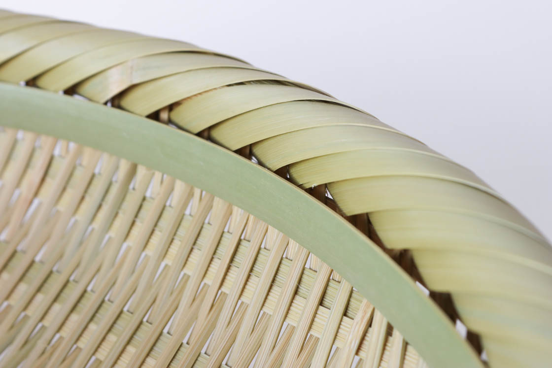 縁には表面を磨いた竹を使い、「巻き潰し」の技法で仕上げています。