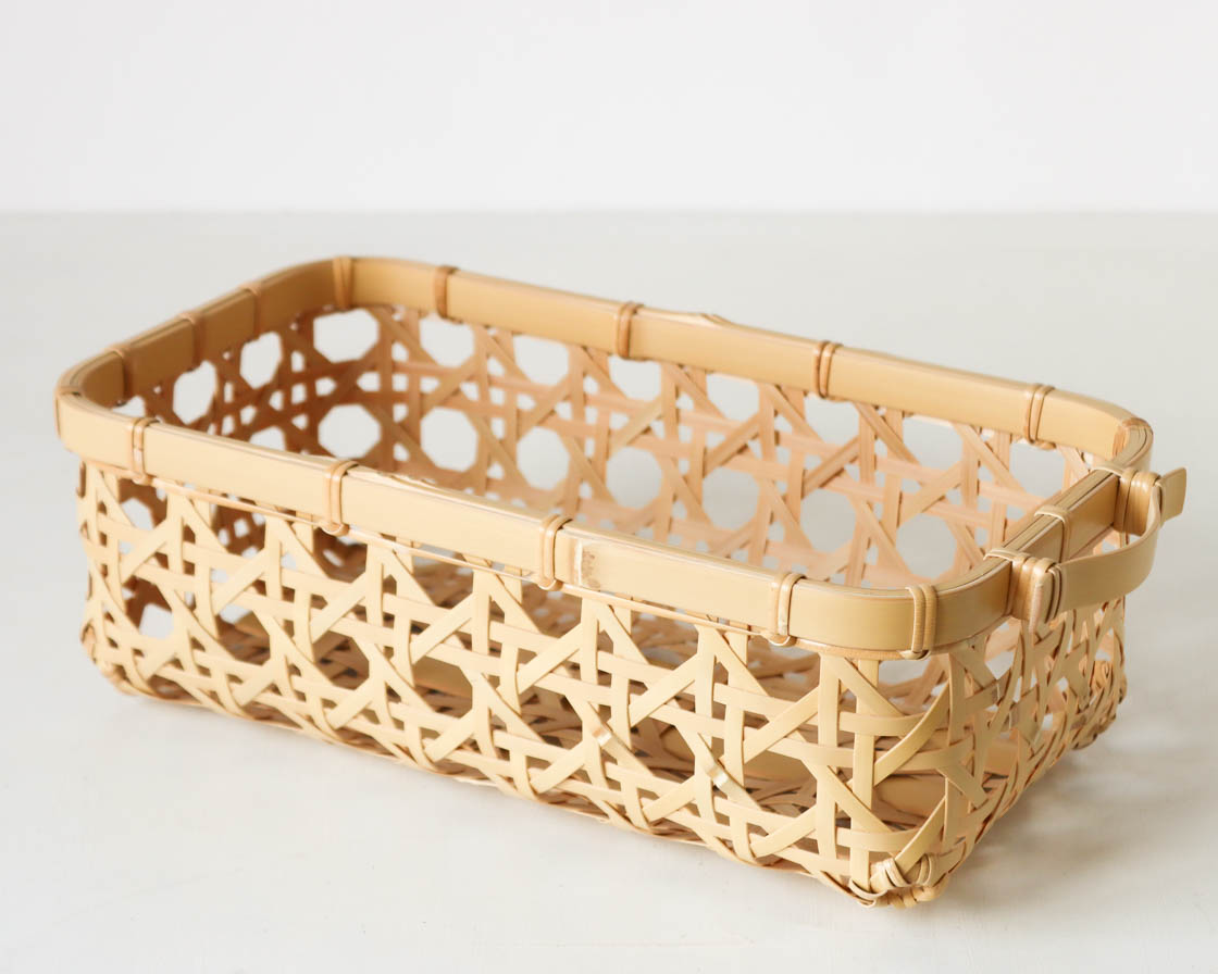 丁寧な八つ目編みで仕上げた長方形のトレイ。食パン2欣がちょうど収まるサイズです。