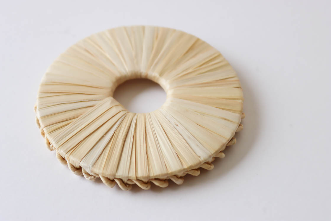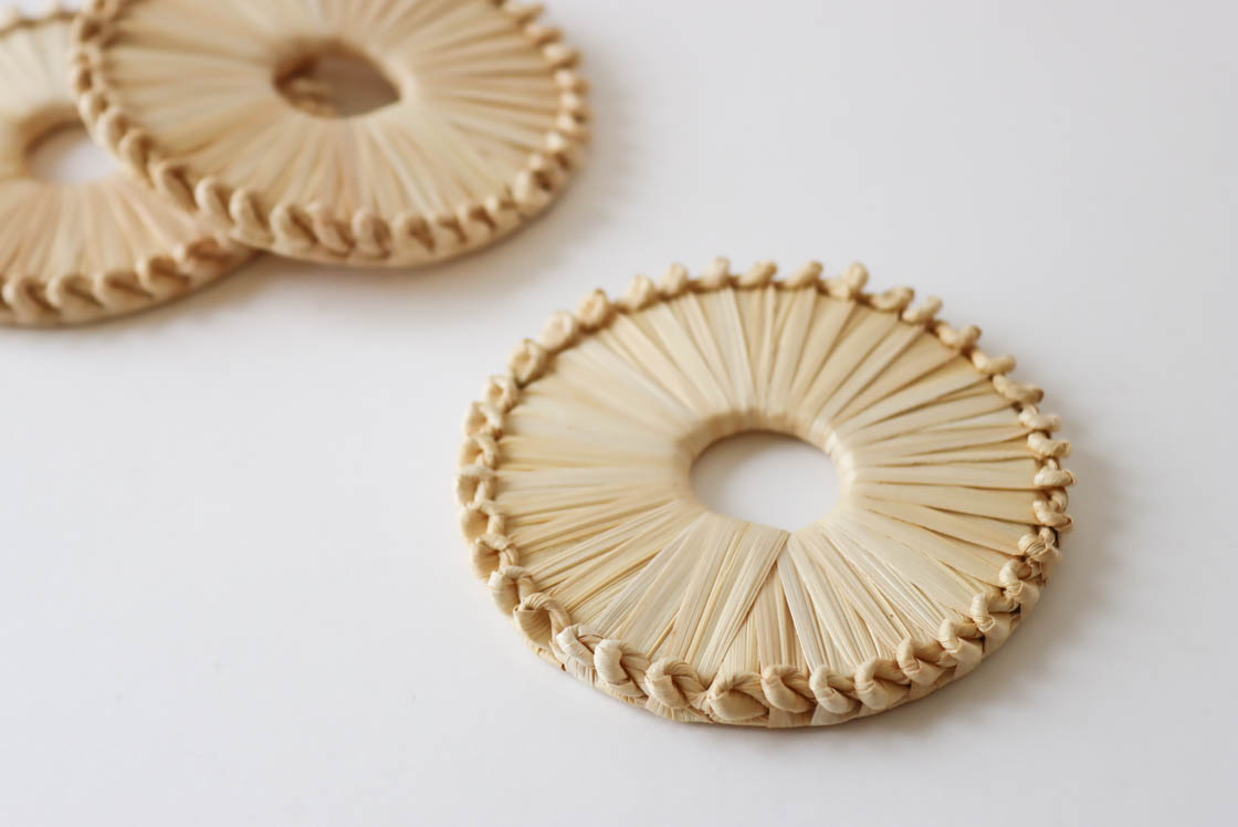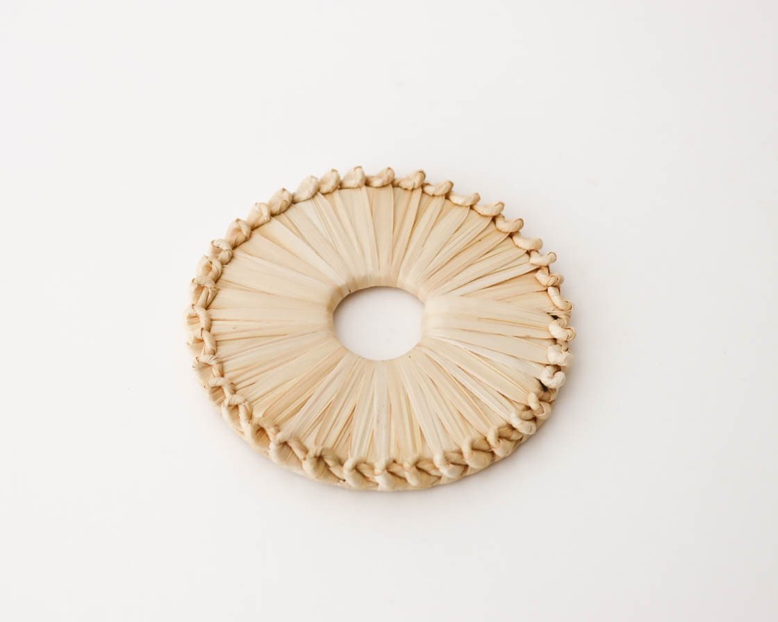 小さなコースターは、明るい色合いとつや、スゲ素材独特の手ざわりのよさを感じられる一点です。