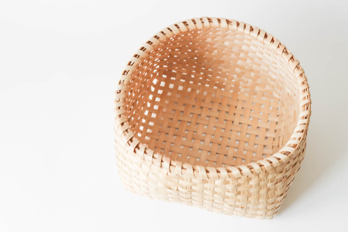 手なじみのよいふっくらとした形。使うほどに光沢が増し、数十年を経て使いあめ色になっても使える丈夫な木籠の魅力を感じていただければ幸いです。