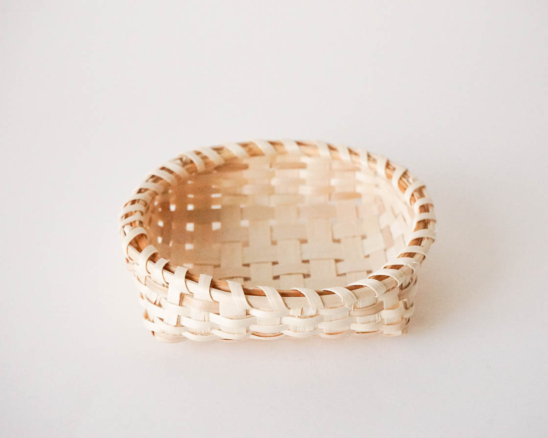 編み材には、光沢のあるモミジのへぎ材を使用。縁は、弾力のあるヤマウルシとヒノキの枝で巻き上げて、なめらかな手ざわりに仕上げています。