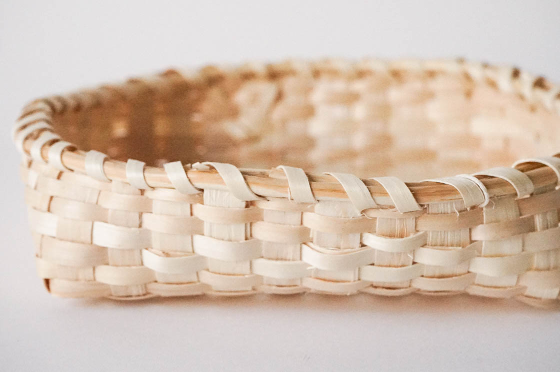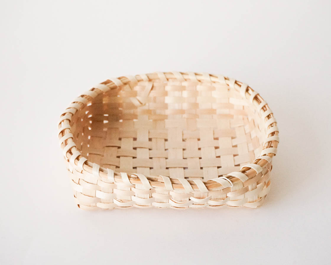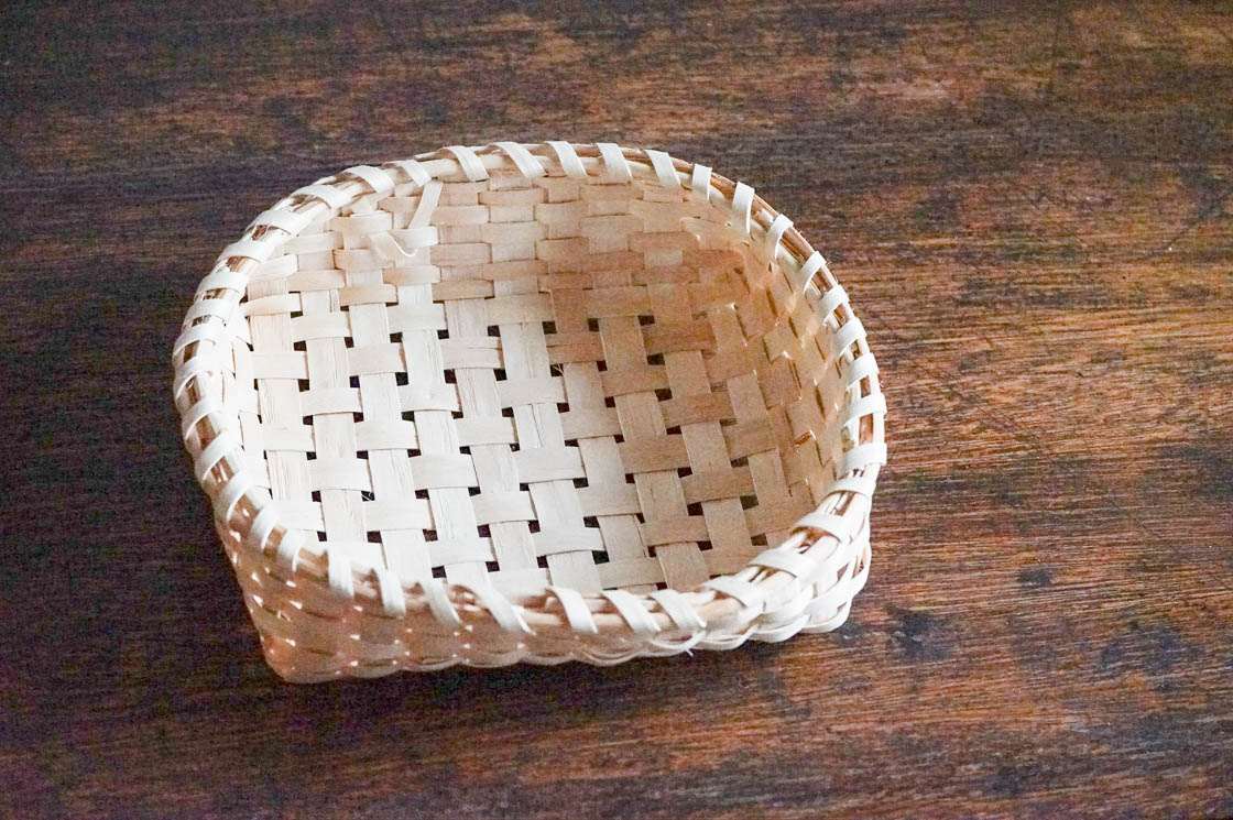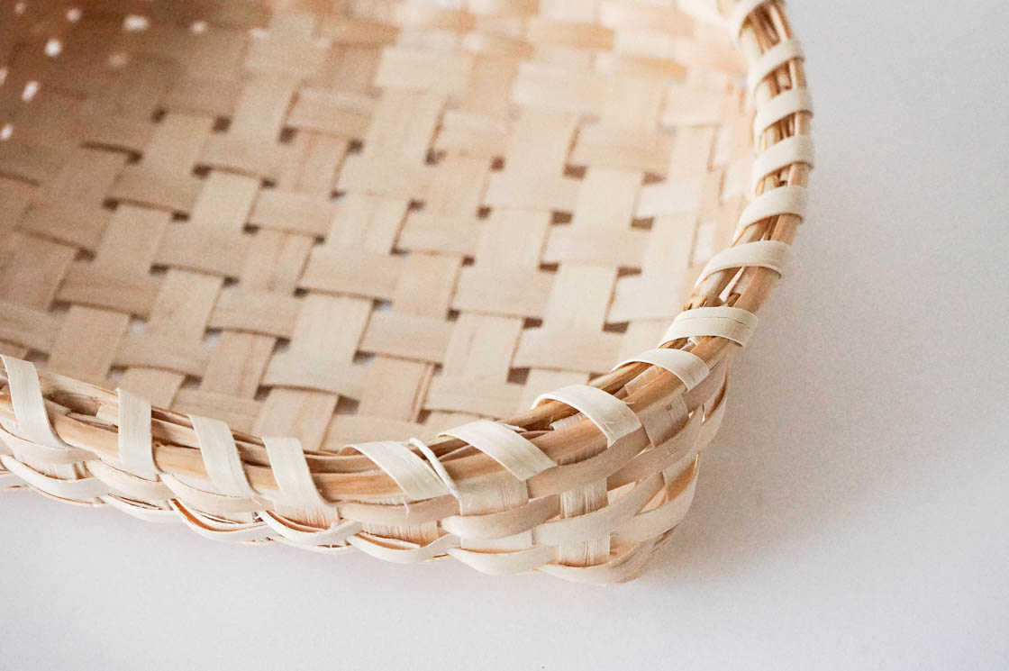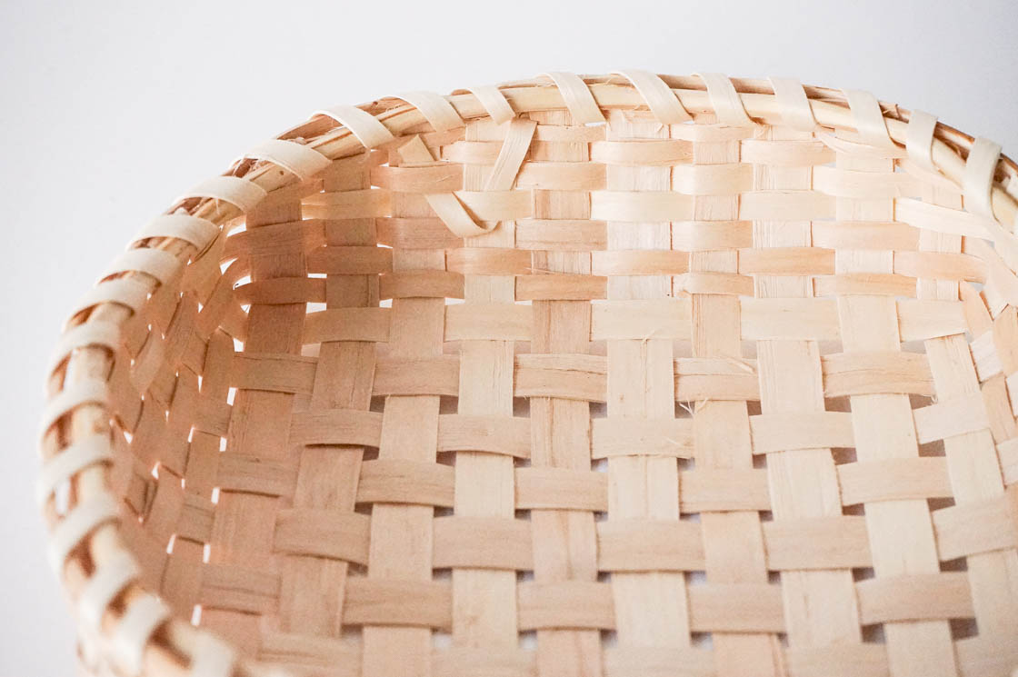 編み材には、光沢のあるモミジのへぎ材を使用。縁は、弾力のあるヤマウルシとヒノキの枝で巻き上げて、なめらかな手ざわりに仕上げています。