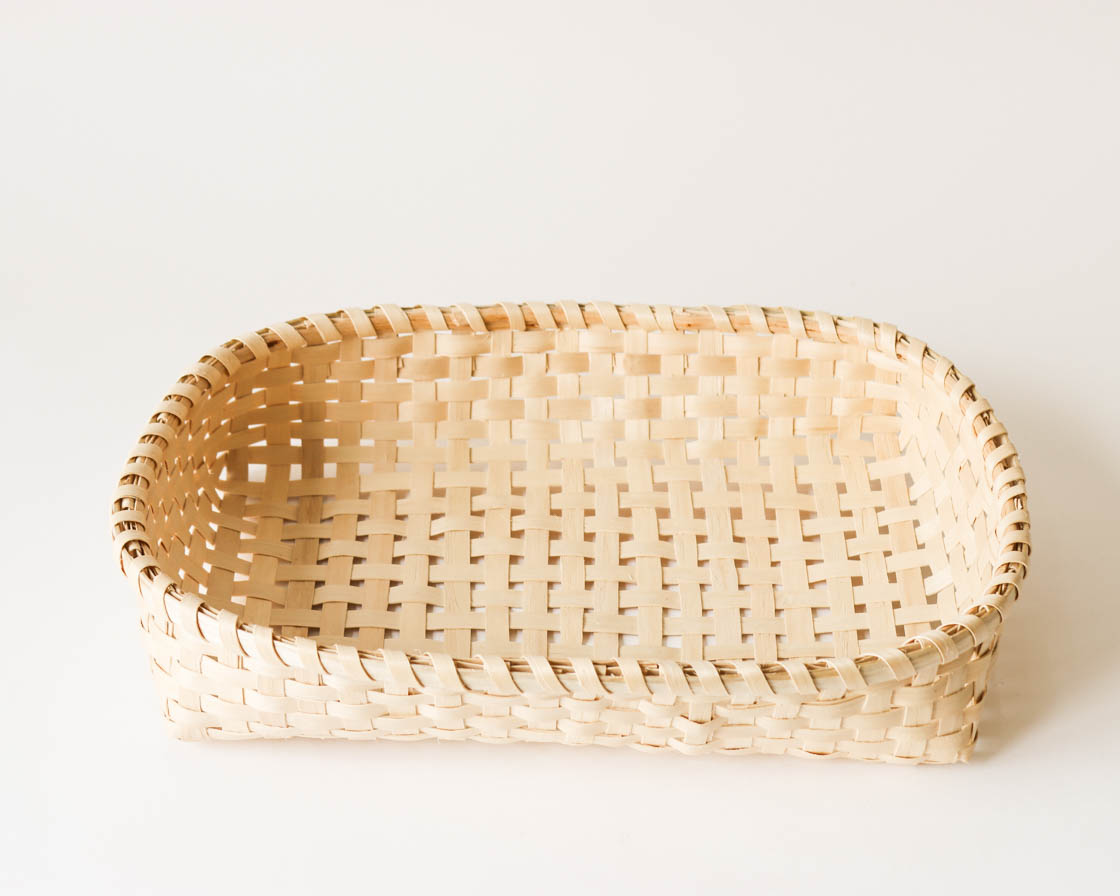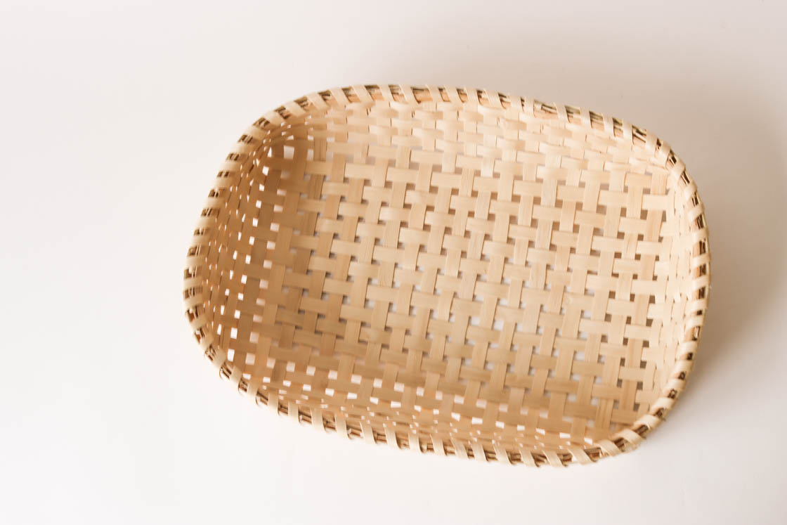 テーブルに映える白木のかご。パンやくだものをたっぷり載せられる底広の作りです。
