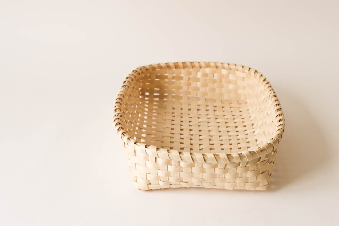 手なじみのよいふっくらとした形。使うほどに光沢が増し、数十年を経て使いあめ色になっても使える丈夫な木籠の魅力を感じていただければ幸いです。