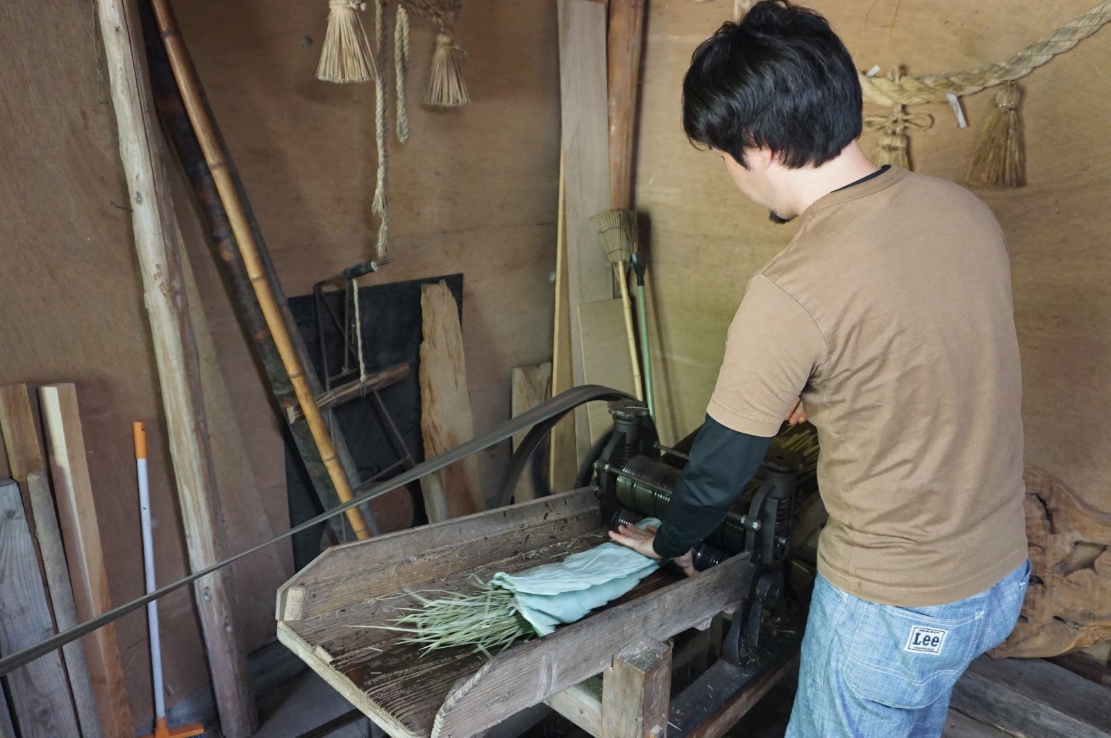 続いて、湿ったわらを束にしてから、しなやかさを出すためのなめし作業を繰り返します。
