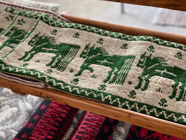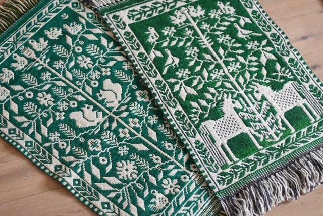 独自の「二重織り」によって描かれる毛糸の絵織物には、身近な植物や鳥、森の動物たちや人々の暮らしが多く描かれています。まるで古い時代の童話の世界のようですが、いまも変わらず自然と共存しているヤノフ村の日常の風景です。