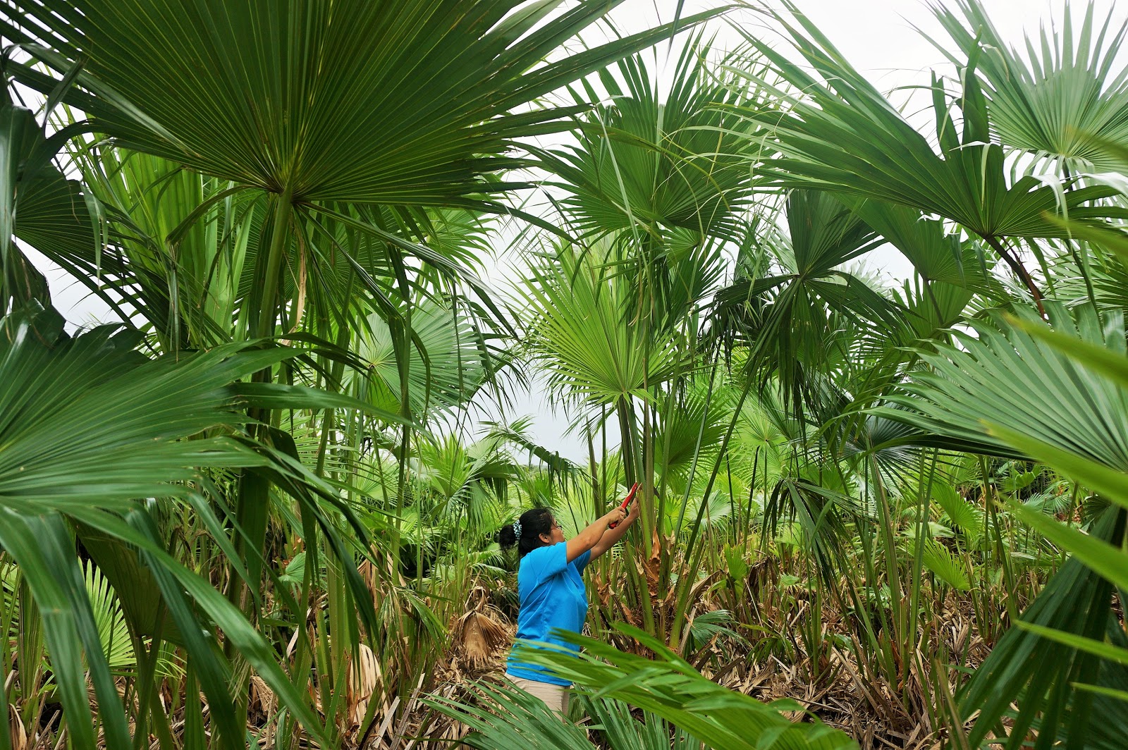 与那国島より與那覇有羽さんにお越しいただき、ビロウ(ヤシ科)の葉を