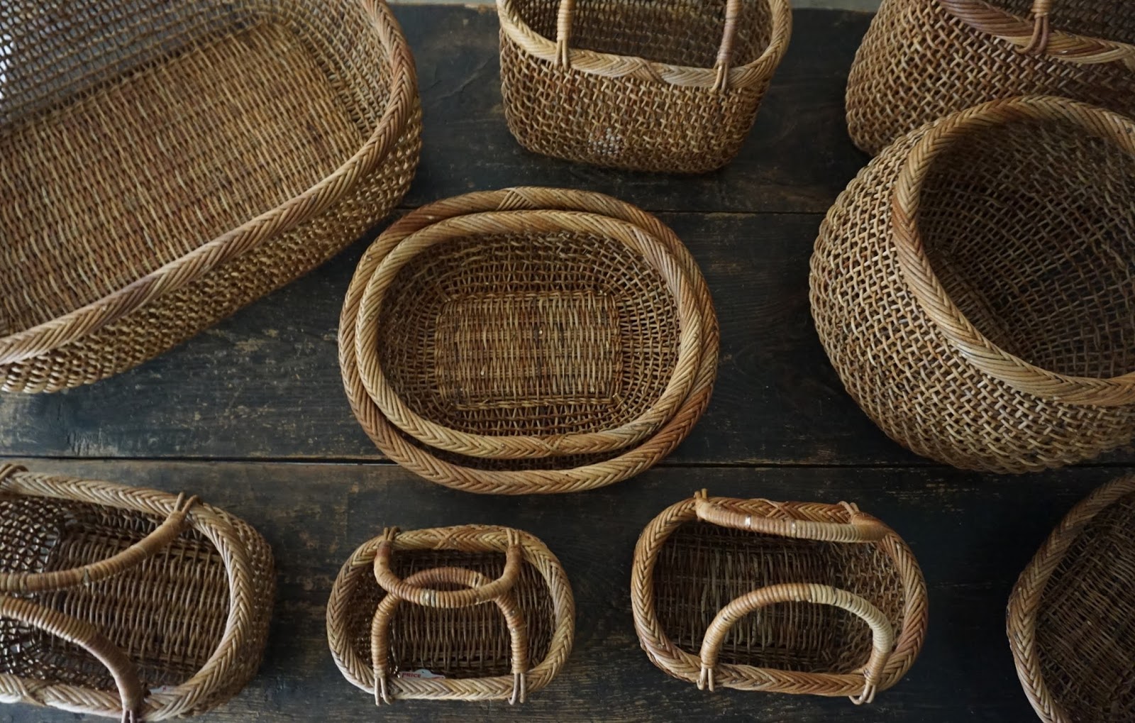 中川原さんご夫婦の手がけるさまざまな種類のかごを、できるだけたくさんの