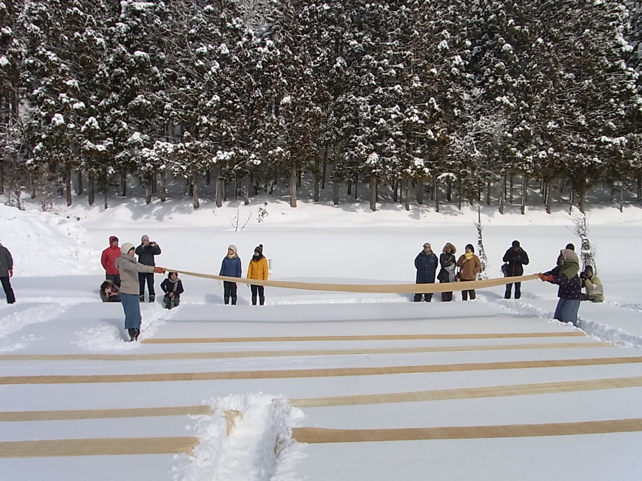 おなかを満たした後は、からむし織の「雪晒し」の実演を見学。