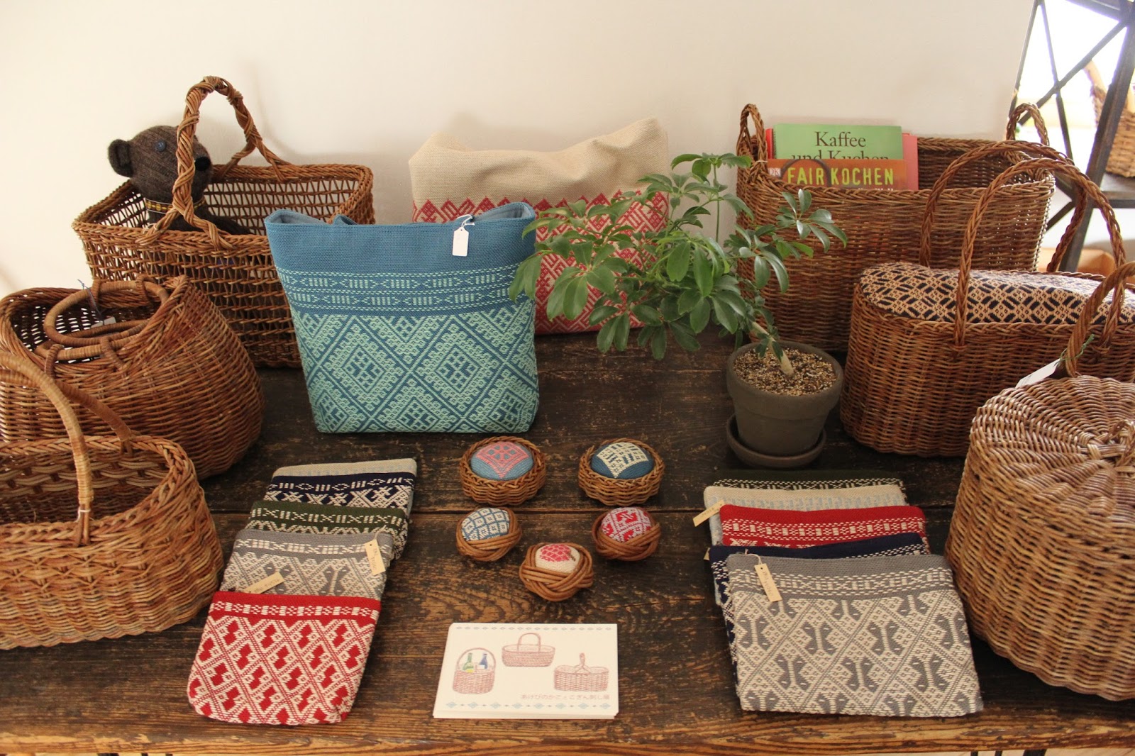 こぎん刺しは、色とりどりのポーチを中心に、手提げやショルダーバッグも