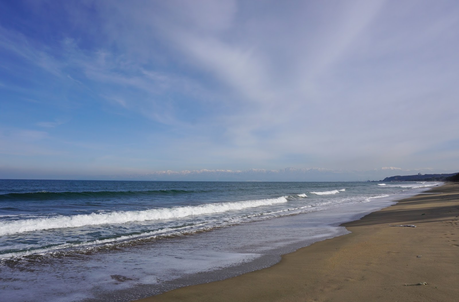 浜辺からは、海を挟んだ先に白い雪に覆われた