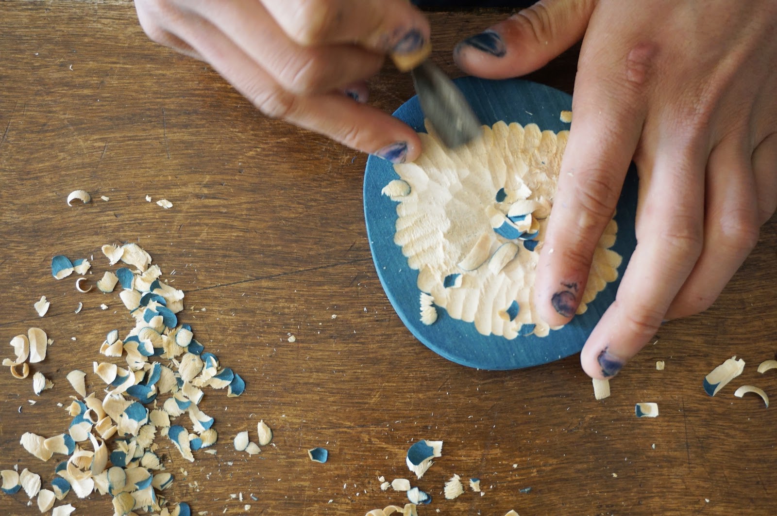 ワラやくるみ樹皮の編組細工、藍で生地染めした木工品、山の木々を