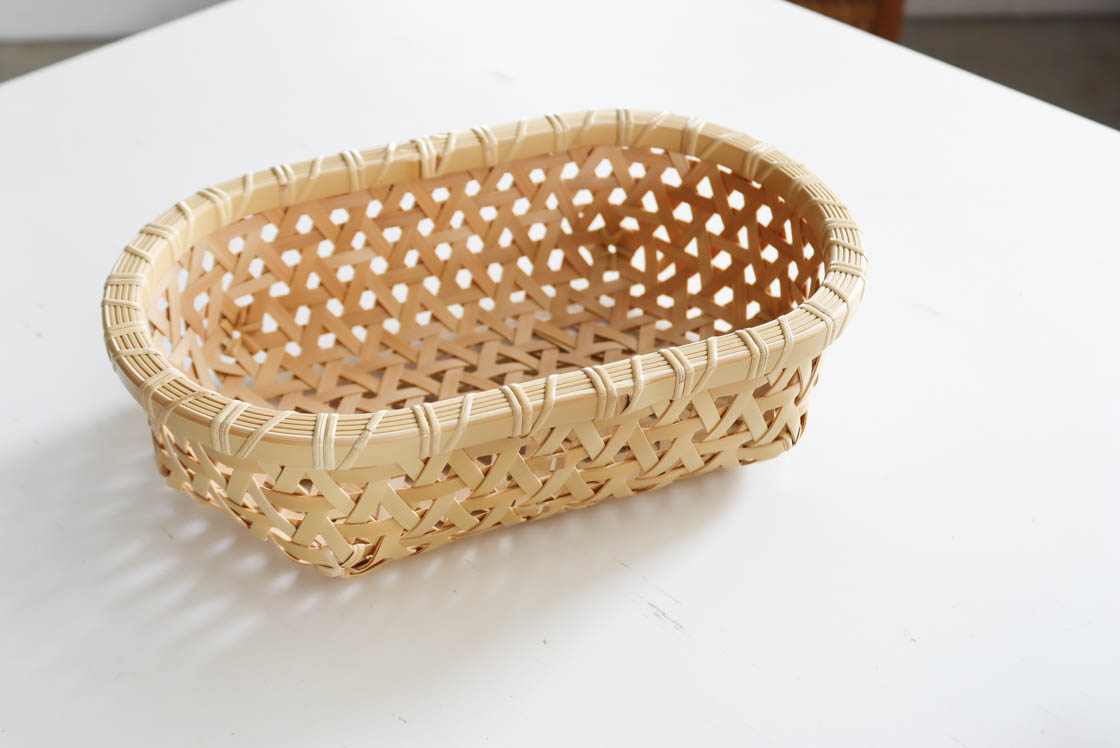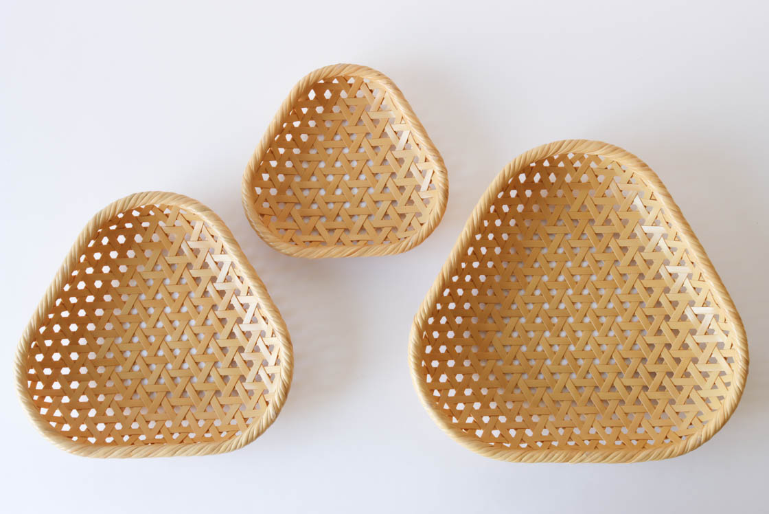 六角形の模様を描く「亀甲編み」は、別府竹細工の伝統を感じさせる美しい模様です。楽しい形とともに、食卓を盛り上げてくれることと思います。