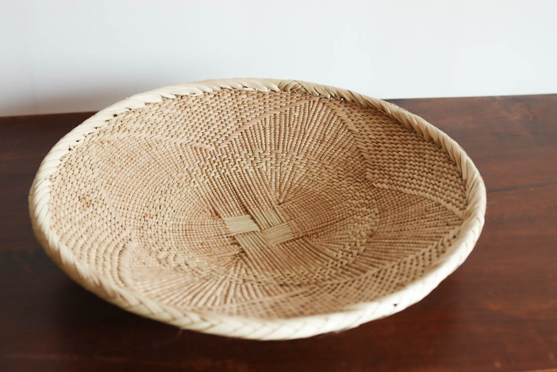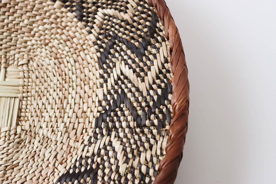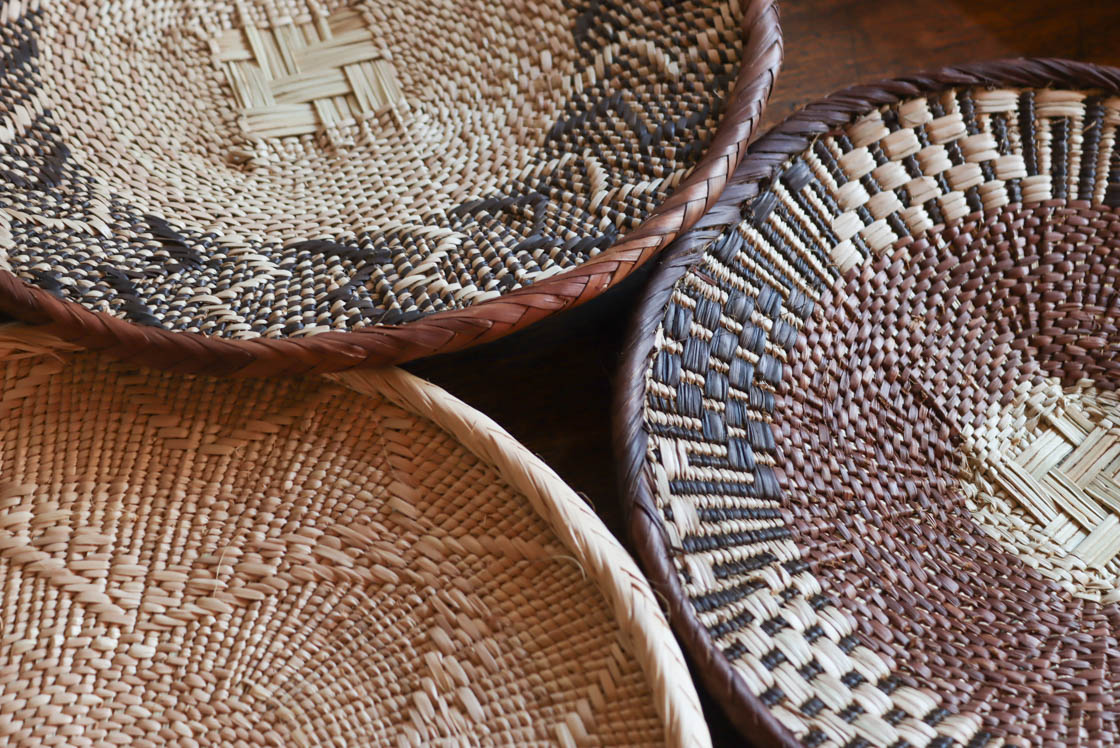 壁を飾るインテリアとしても人気のあるビンガ地方のバスケット。こまかく裂いたヤシの葉に、樹皮や泥をつかった昔ながらの方法で染色をほどこし、細密な模様が目を楽しませてくれます。