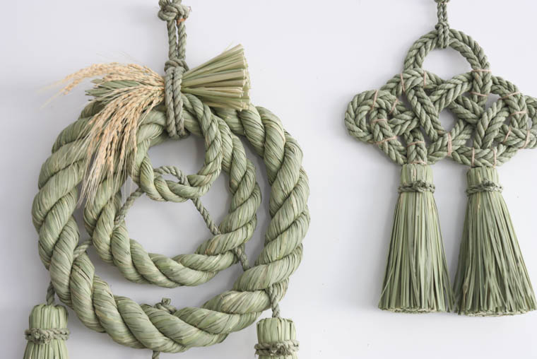 地元の七五三縄(しめなわ)づくりの技とともに、地域の伝承や、古来の結びを取り入れて生まれたのが、わら細工たくぼの「縁起物のお飾り」。