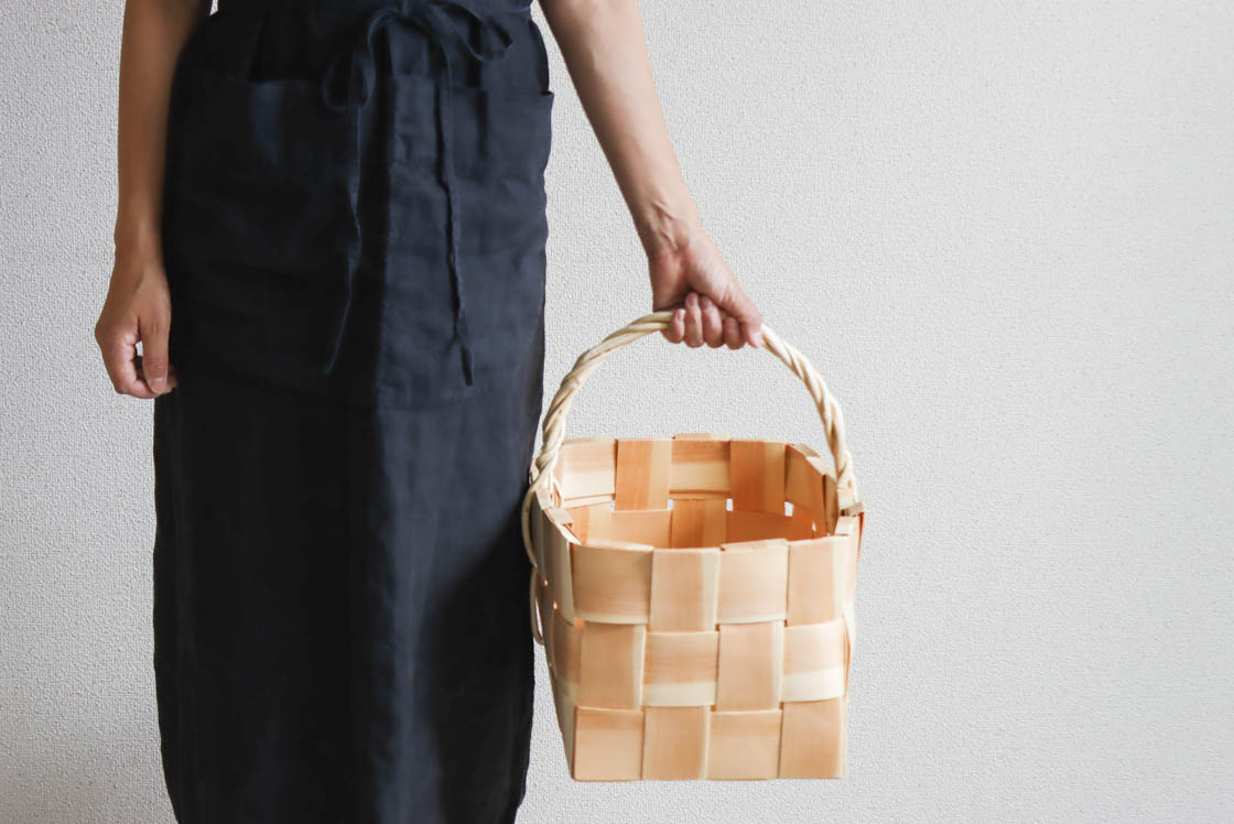 このパイン材をスライスして編んだバスケットは、木箱のように収納しやすく、軽量ながら容量もたっぷり。無垢材の特徴として、時間とともに深まっていく経年変化もたのしんでいただけます。