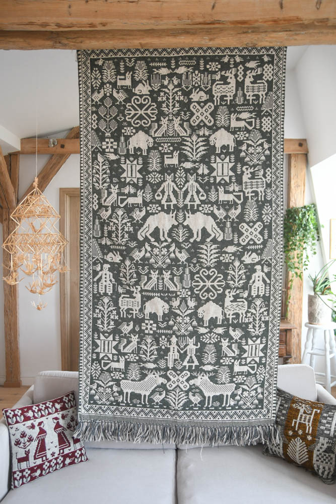 農村の日々や森、生き物たちの姿を、縦と横の糸に映しとった作品からは、深い愛情と誇りが伝わってきます。
