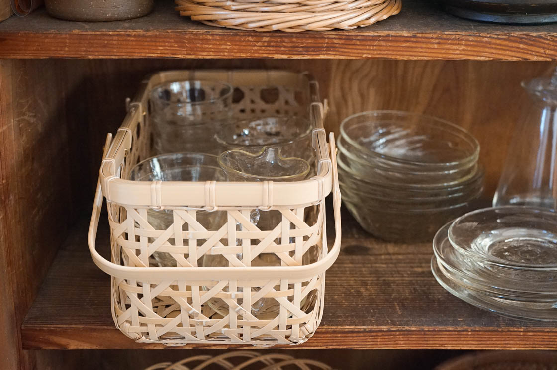 棚置きの際、出し入れに便利な取っ手を片側に取り付けた「引き出しタイプ」は、浅型と深型の2サイズ展開。見た目にもうつくしい八つ目編みのかごです。