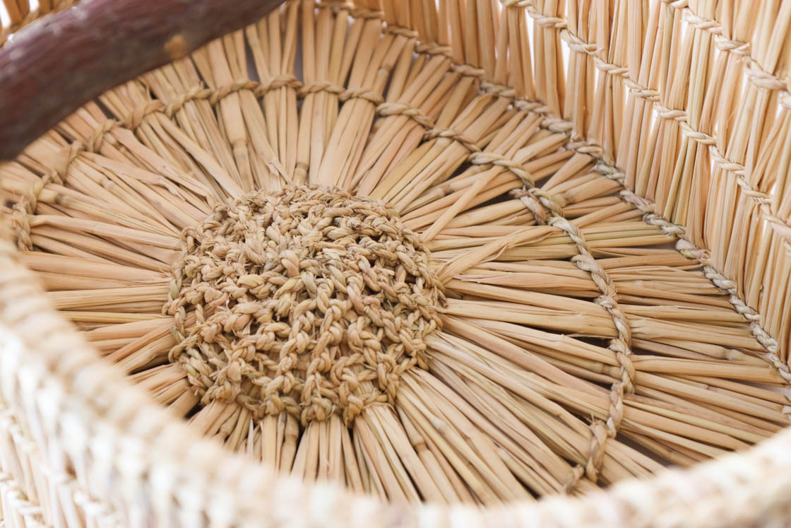 作りの基本となっているのは、日本に古くから伝わる「畚(ふご)」の製作技術です。底の中心部を藁縄で固く結び上げることにより、稲のかごとは思えない強さを生み出しています。