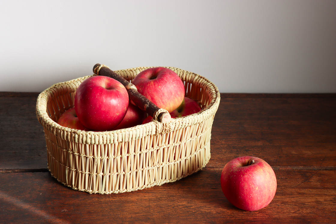 持ち手には、近所のりんご農家さんで剪定された枝を利用。りんご栽培の盛んな安曇野の風土を映し出した、環境にもやさしいかごとなっています。
