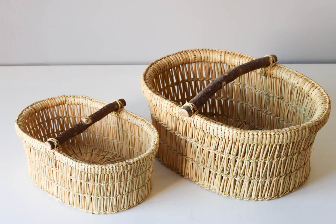 「手持ちかご」は、同じく楕円をベースに、藁の縄をしっかりと巻き上げた一本手のデザインです。ちょっとしたおでかけには、こちらが便利です。