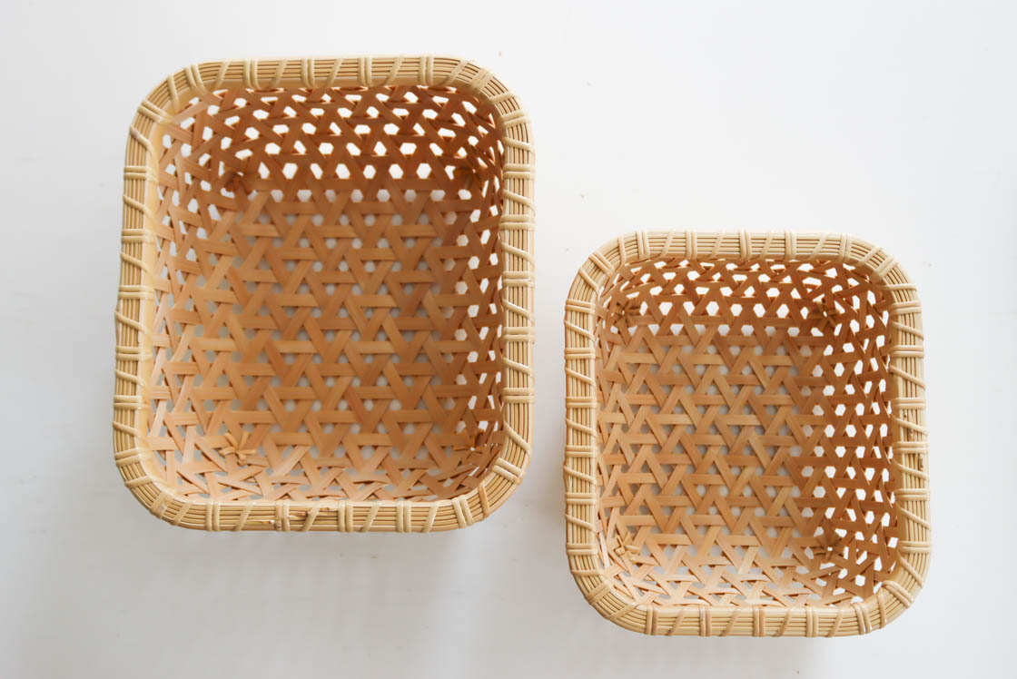 食卓のトレーとして、お皿代わりにもつかってほしい三角形の盛りかご。入れ子になる3サイズの展開です。