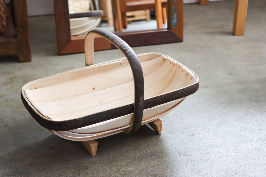 昔ながらの重たい木の器に代わるかごを、1800年代に活躍した職人トーマス・スミス氏が考案。頑丈な栗の木をフレームに、薄く削ったヤナギを本体に使うことで、軽量化とサイズの規格化を実現しました。