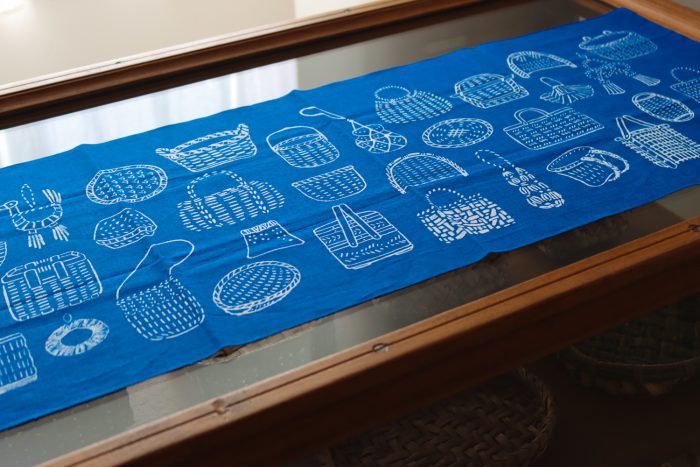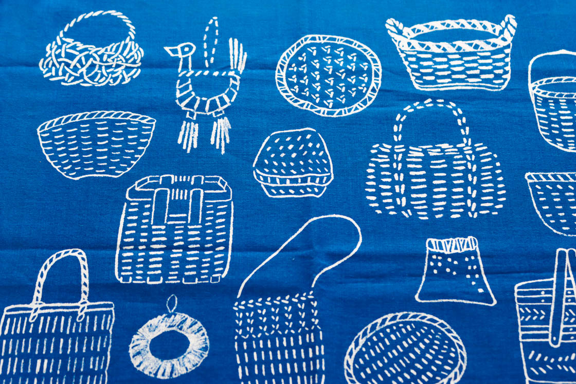 素材も技法もさまざま、個性ゆたかな各地のかごを描いた、当店オリジナルの『かご手ぬぐい』。