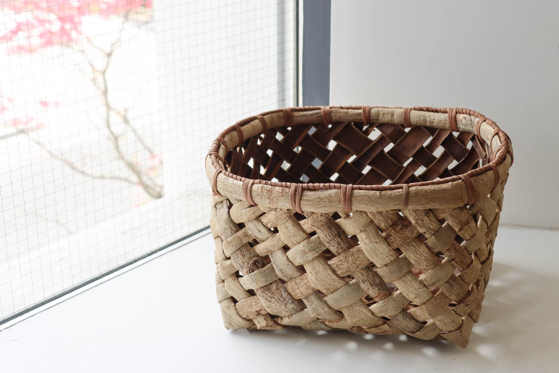 幅広の樹皮をななめに編んだ、野趣を感じるデザイン。オブジェのような存在感があります。