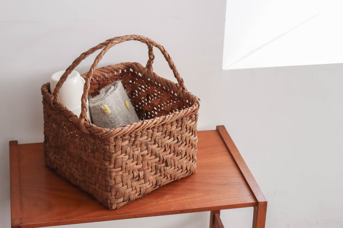 正方型の収納かご。二本の持ち手がついているので、おでかけにも便利なつくり。