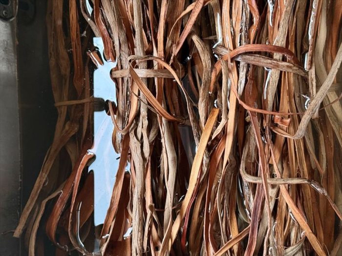 池田さんは、ブドウ・クルミ・カエデなどの樹皮に加えて、マタタビやアケビなどの蔓、ガマやススキなど、さまざまな素材を扱うことのできる数少ないかごの作り手の一人です。